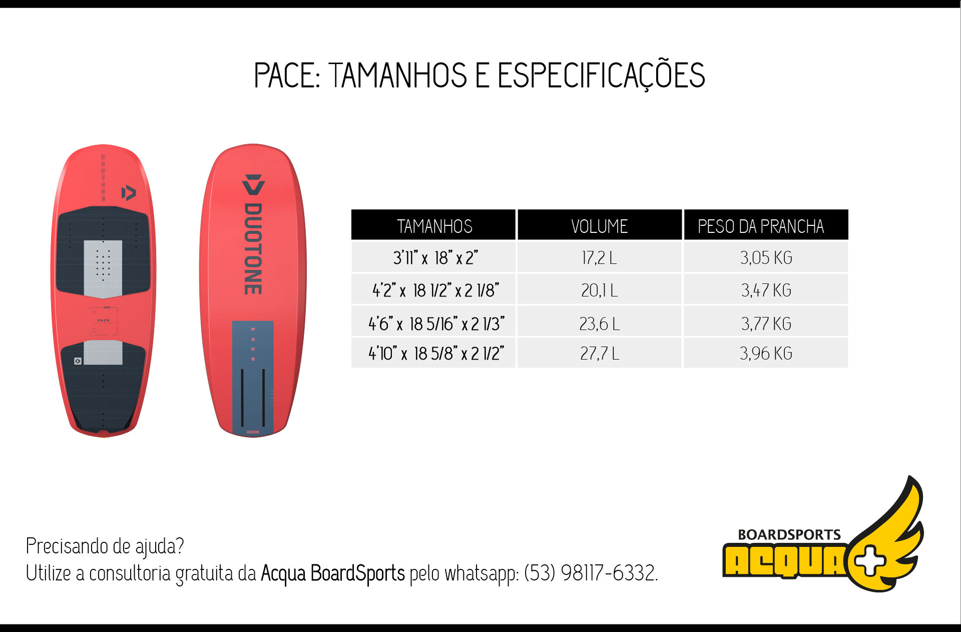 A linha PACE é muito versátil, oferecendo desde pranchas menores no estilo pocket até modelos maiores do tipo cruiser, facilitando a escolha do tamanho ideal para o seu estilo de pilotagem e nível de habilidade. Voar contra o vento é, claro, uma das principais características da PACE, com bordas otimizadas que possibilitam ângulos de inclinação impressionantes. As múltiplas opções de footstraps tornam fácil encontrar a posição perfeita para suas preferências pessoais. Construída para resistir ao tempo, esta construção de moldagem precisa da Pace garante facilidade de uso, muito controle e velocidade.