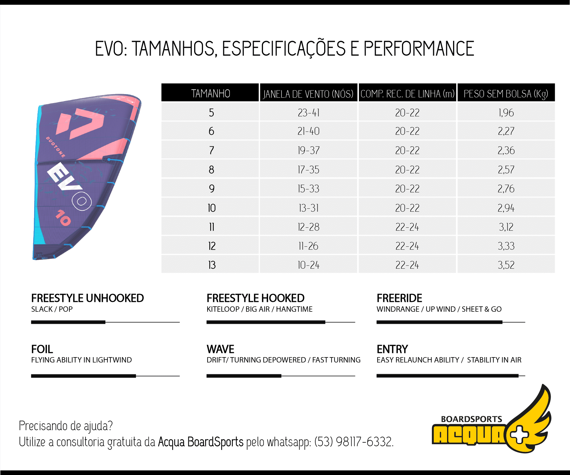O EVO pode ser utilizado com quatro ou cinco linhas, e seu design delta de três longarinas está pronto para qualquer desafio. Kiteboarding sempre foi sinônimo de liberdade – não deixe outros kites te limitarem, deixe o EVO te levar além!