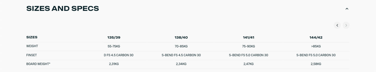 O carbono biaxial é usado na construção, o que melhora ainda mais o desempenho e a responsividade da prancha, proporcionando uma navegação extremamente dinâmica.