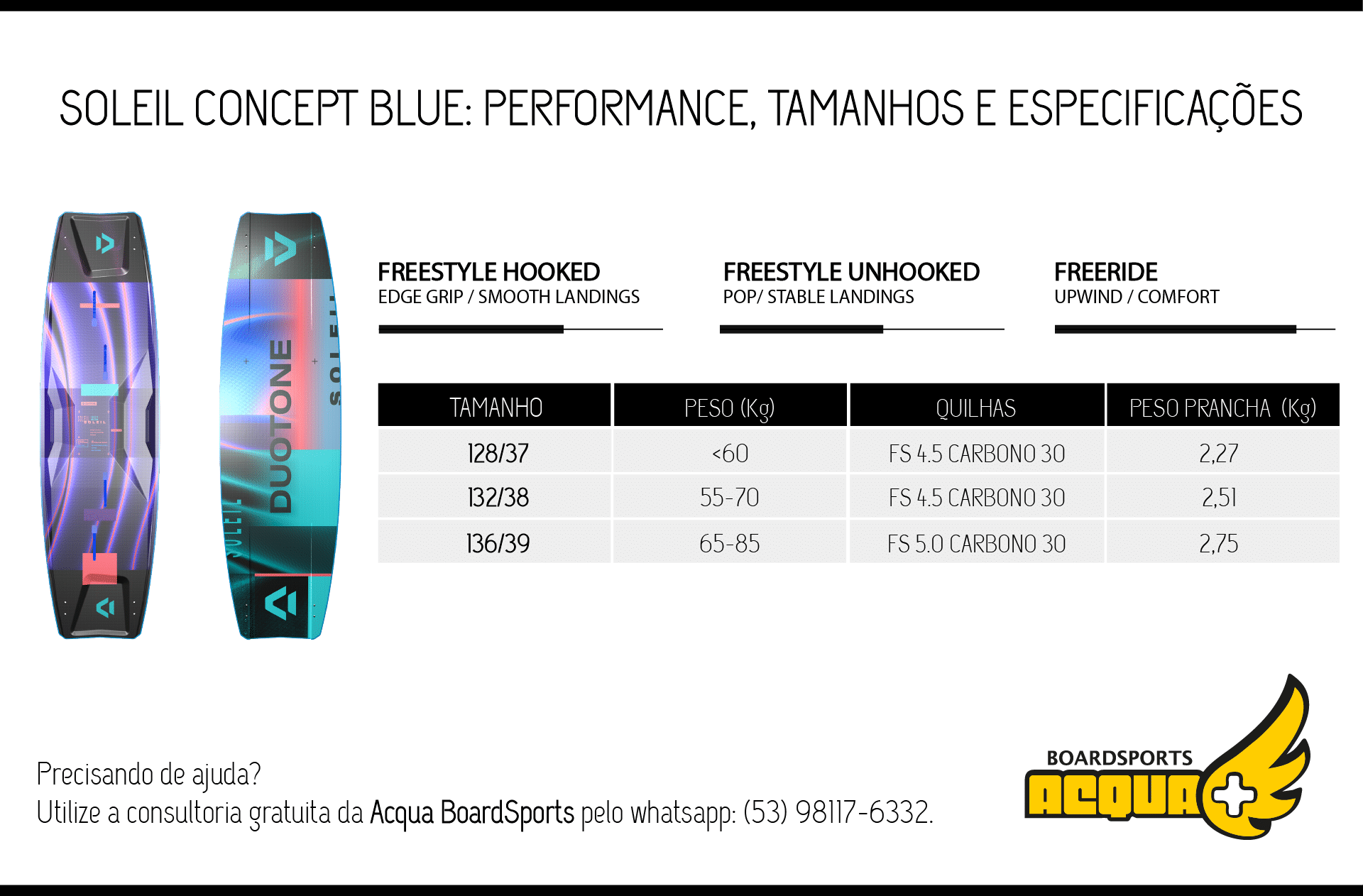 Em resumo, a SOLEIL CONCEPT BLUE é a fusão perfeita entre beleza, inovação e respeito ao meio ambiente. Com recursos projetados especificamente para mulheres, uma construção revolucionária e um espírito de aventura, esta prancha redefine a maneira como você vivencia o kitesurf.