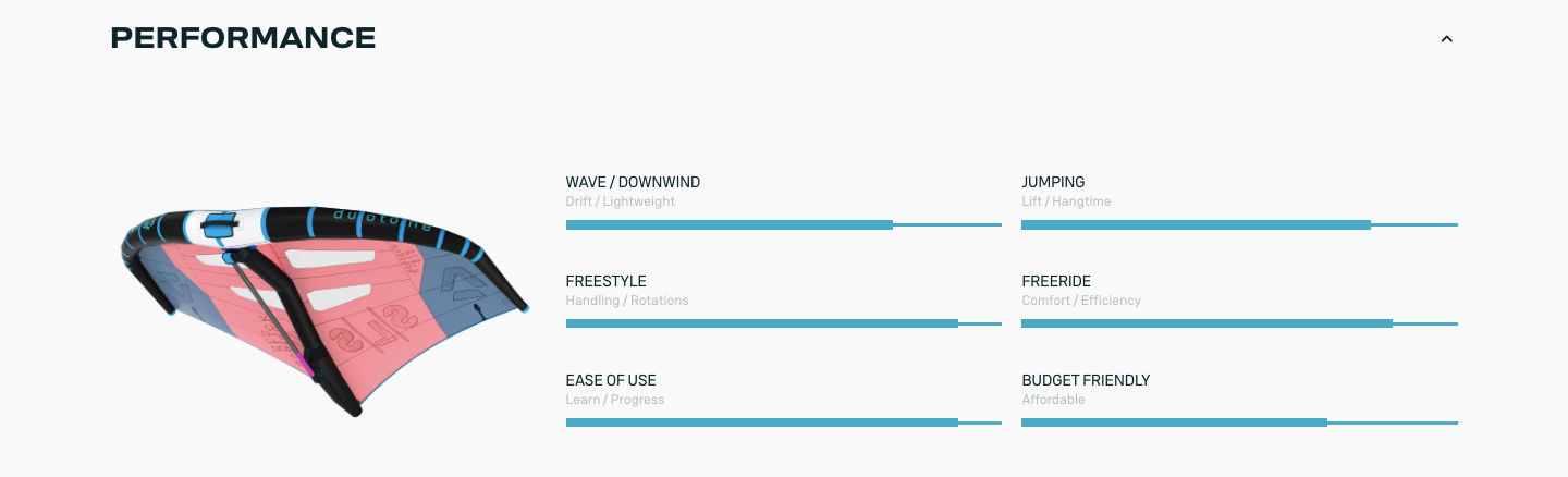 A borda de ataque segmentada permitiu ao designer Ken Winner aumentar a rigidez e a solidez na seção central, utilizando material mais forte, resultando em uma transferência de potência direta e uma asa altamente responsiva.